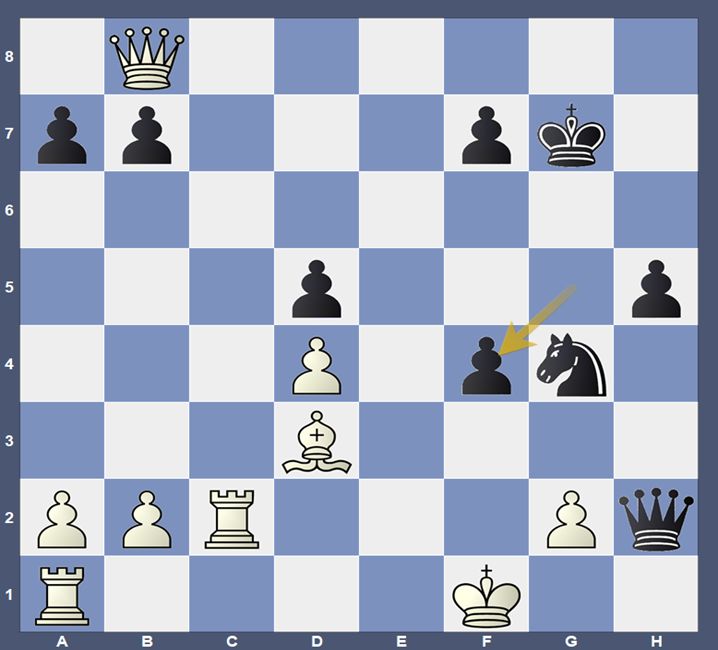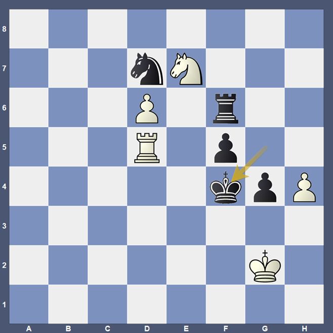 Například po tahu Kf4 mohl David rychle remizovat tahem h5! Po jakémkoli ústupu králem (aby uvolnil postup f5-f4), přijde Vxf5 a po výměnách bílý postoupí h6! Po Kg6 bílý napadne pěšce Kg3 a posledního pika sebere a remis…