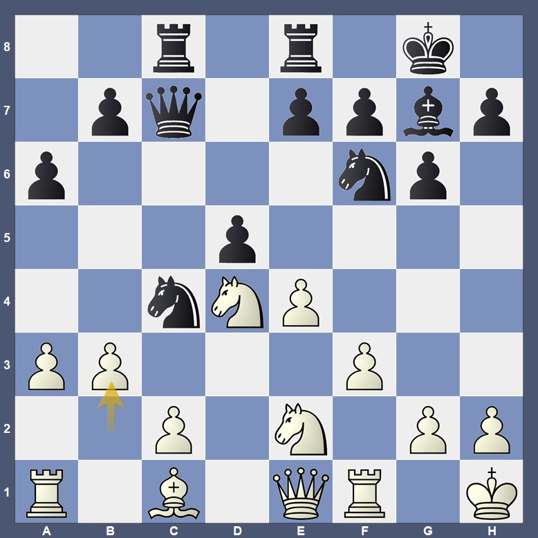 Martin získal černými figurkami velmi příjemnou pozici. V pozici na diagramu bílá zahrála b3, čímž napadla jezdce na c4. Martin ustoupil Jb6. Kdyby si však všiml velmi pěkné kombinace, určitě by zahrál b3- e5!! … po bxc4-exd4, cxd5-cxd5 se totiž mohlo objevit Jxd5!! a po exd5 d3 s dvojím úderem na jezdce na e2 a věž na a1. Martin si bohužel neuvědomil, že všechny jeho figury stojí “předpisově”, a proto měl hledat taktické řešení pozice. Škoda moc hezké kombinace, která zůstala “za branami”! Kdyby bílá do této kombinace nešla, pozice by se bílé po e5!! zcela rozpadla.
