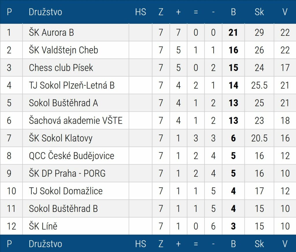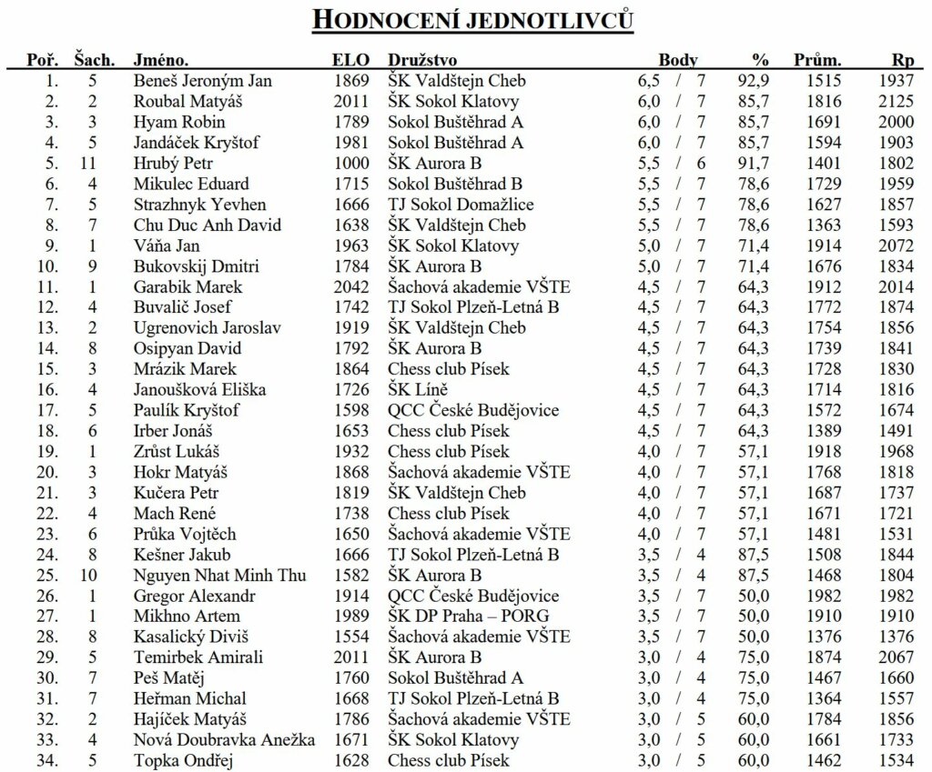 I přesto, že se nám odpolední kolo nepovedlo, musíme vyzdvihnout výkon Marka a Lukáše, kteří v tomto dvoukole uhráli shodně 1,5 bodu. Jak napovídá tabulka výsledků jednotlivců, sázíme na vyrovnaný kádr. Čtyři kluci ze základní sestavy se vejdou od 15. místa do 22. místa.