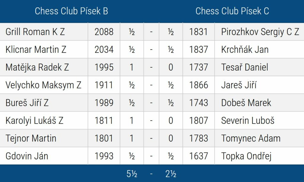 Honza hrál na poslední šachovnici s Ondrou. Honza byl trochu zdravotně indisponován, a tak záhy ve vyrovnané hře nabídl remízu, kterou Ondra přijal. Po dvou hodinách porazil Martin Adama, když využil Adamova zaváhání a dostal se k útoku na krále, který Adam neustál. Luboš hrál bílými figurami proti Lukášovi a v zahájení obětoval pěšce. Nicméně kompenzace za něj byla nejasná, a tak po přehlédnutí mezi šachu ve střední hře došlo k hromadné výměně figur a následná věžovka byla díky postouplým pěšcům černého pro Luboše prohraná. Maksym hrál černými s Jirkou Jarešem a jejich partie postupně dospěla k zasloužené remíze. Honza Krchňák, nováček v našem klubu, potrápil Martina na druhé desce. Hrálo se skotská, kde Martin na konci bránil úspěšně remízu. Roman na první šachovnici stále lépe od zahájení, udělal Serghiovi dva izolované dvoj pěšce, ale nedokázal najít cestu k vítězství. Zajímavá partie se odehrávala na třetí šachovnici, kde Dan rozhodl vyměnit svého domovníka za věž, čímž na sebe otevřel diagonálu pro soupeřovu dámu. Následný útok Dan neustál a Radek jej porazil. V nejdelší partii dne se Marek tlačil černými na bílého krále. Svoji snahu však přehnal a Jirka Bureš jej pomohl potrestat. Nicméně i on zvolil špatné pokračování a jeho král byl vážně ohrožen. Nicméně Marek toto pokračování neviděl. Jirka se následně dostal v koncovce do lepší pozice, ale nechal si pak vyměnit věže a partie přešla do rovné koncovky různobarevných střelců.