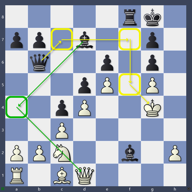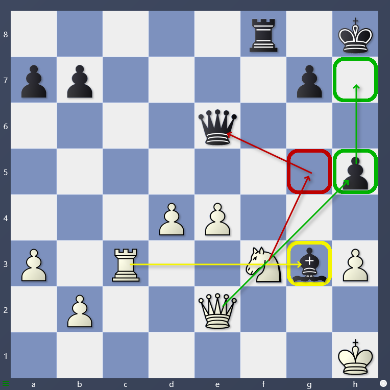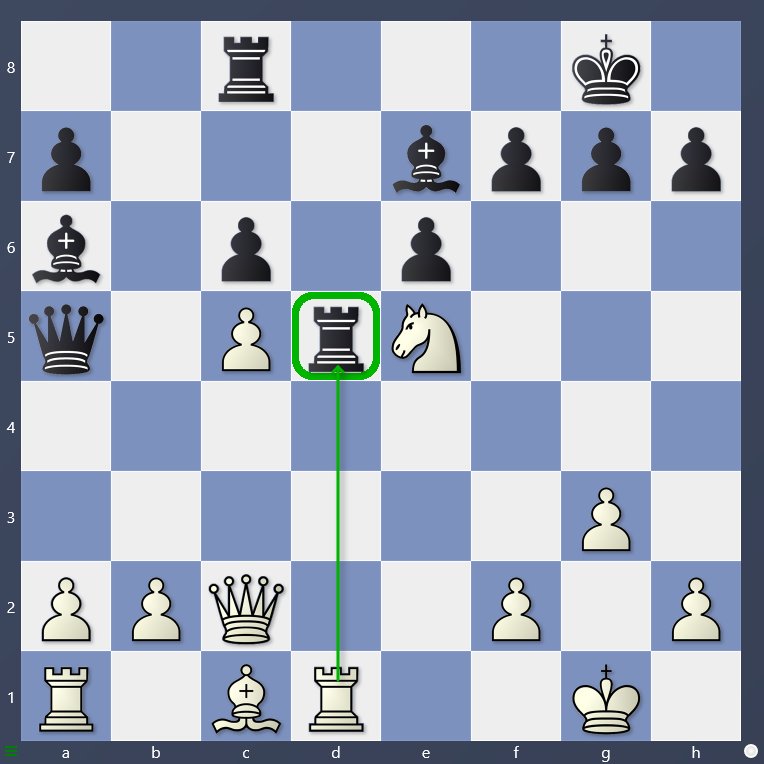Bílý na tahu sebral věží d1 věž na d5. Tadeáš bohužel nenašel hezký mezišach De1+!! Po Kg2, Df1+, Kf2, Dh1+, Ke3 a Dxd5 by vyhnal bílého krále do centra, kde by zahynul hanebnou smrtí.